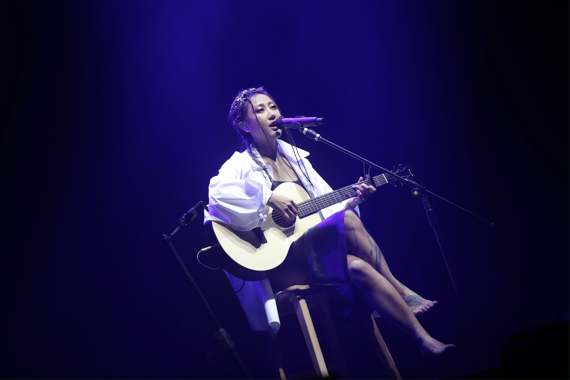 直到演出的尾声,动画停止,巨大的雕塑也隐去,台上只有陈粒一个人拿着吉他,穿着最简单的白衬衫,在一束追光灯下唱出:“光,落在你脸上,可爱一如往常”。陈粒回到了最本真的样子,洄游到了她走入大众视线的原点。