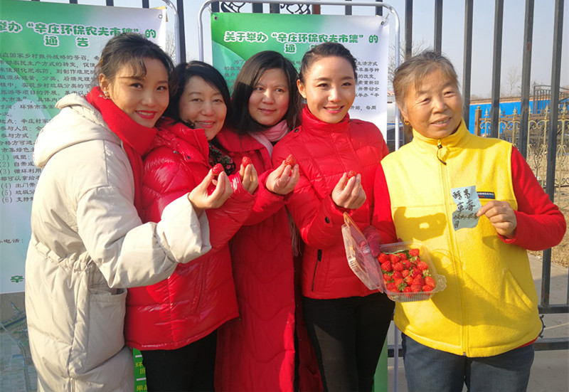 当天上午,在辛庄村的一条崭新的街道上,辛庄环保农夫市集火爆开集,路两侧草莓、苹果等农产品以及各种农户自制酵素等商品琳琅满目。赶集是中国民间的一种风俗,闻听开集消息的人们从四里八乡向这里陆续赶来,熙来攘往好不热闹。村儿里的秧歌队也带来了热闹红火的“小车会”表演,随着“咚咚咚锵锵锵”的锣鼓点以及欢乐的唢呐声,化了夸张滑稽的浓妆大爷大妈大叔大婶们尽情的表演着,“跑驴”“旱船”“猪八戒背媳妇”“大头娃娃”,激情四射的老人家们粗犷、豪放、幽默、泼辣、风趣的表演给现场营造了欢乐的节日气氛,也自然带来了阵阵开心的笑声。市集现场,除了赶集来的人们。
